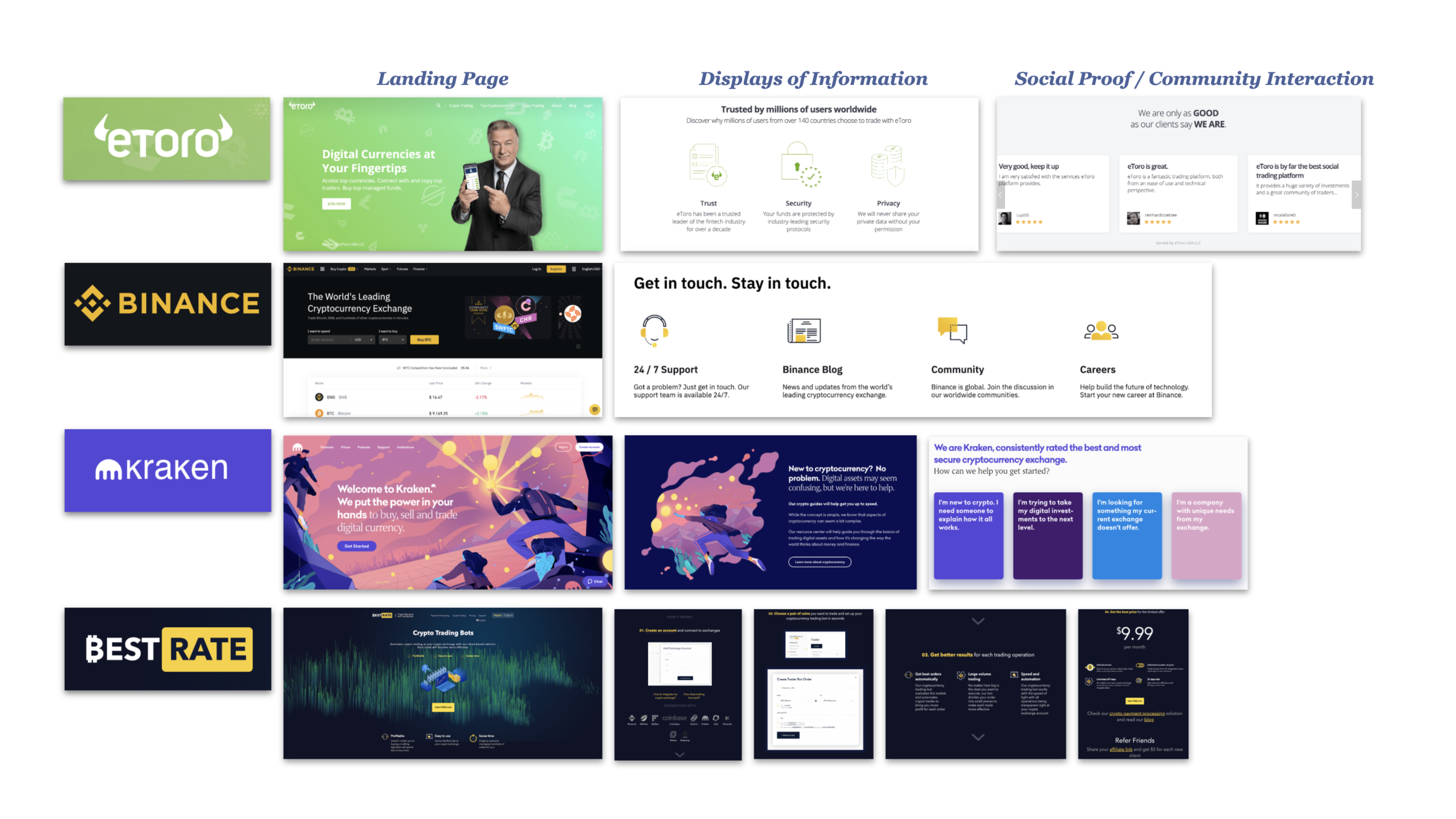 Once I had an idea of the content KoinStreet wants to include on the homepage, I started conducting research on competitors in the digital asset market and what they included on their homepages. For comparison, I looked at three specific components: landing page, displays of features/product information, and social proof/community interaction.